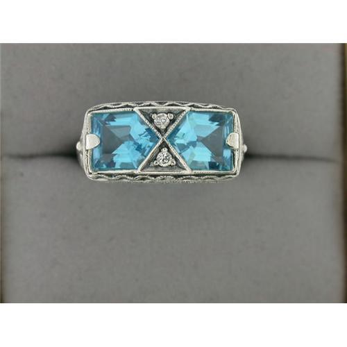 This Vintage style ring from my collection is an Authentic & Accurate copy of a ring from the 1930's - and THIS one is in Mint condition! This STERLING Silver ring features two beautiful BLUE TOPAZ with CZ's set as accent, and surrounded by beautiful filigree work. This ring is a size 8 and I can easily resize it for you.