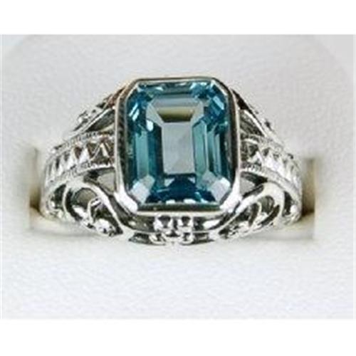 This Antique Style ring is an Authentic and Accurate copy of a ring from the 1930's but THIS one is in MINT condition! It is STERLING Silver and it features a rectangular BLUE TOPAZ = THREE CARATS! This Blue Topaz is surrounded by very beautiful filigree work. This lovely ring is currently a size 8.