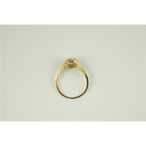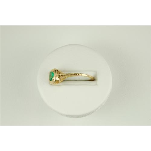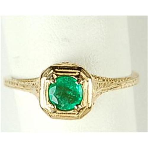 This Antique Style ring is an Authentic & Accurate copy of a ring from the 1930's - and - THIS one is in Mint condition. It is a 14k yellow gold ring featuring a beautiful Genuine deep green Emerald = .40 Carats! The ring is a size 6 1/4 and I can easily resize it for you.