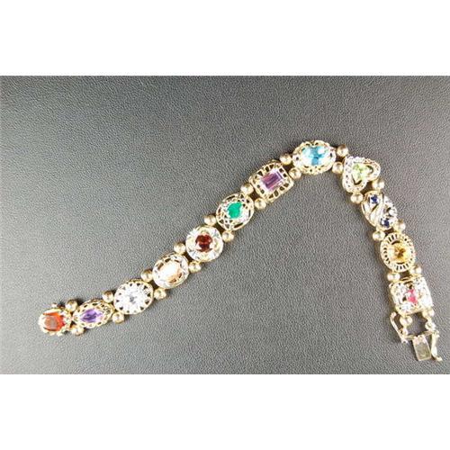 This beautiful ANTIQUE STYLE GOLD SLIDE BRACELET features 12 different Slides set with Gemstones. The Gemstones include Garnet, Cameo, Amethyst, Blue Topaz, Sapphire, Citrine, Ruby and Peridot. This 10K Gold SLIDE BRACELET is 7 inches in length and it is in Mint condition!