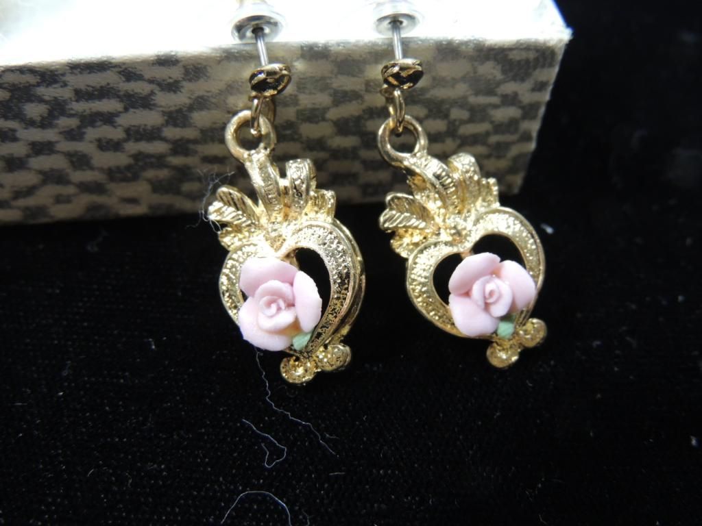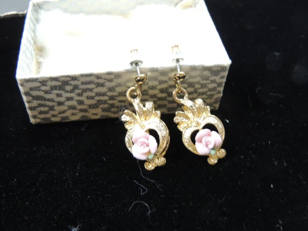 VINTAGE STYLE GOLD TONE DROP EARRINGS . HEART ROSE. SEE PICTURE FOR DETAILS