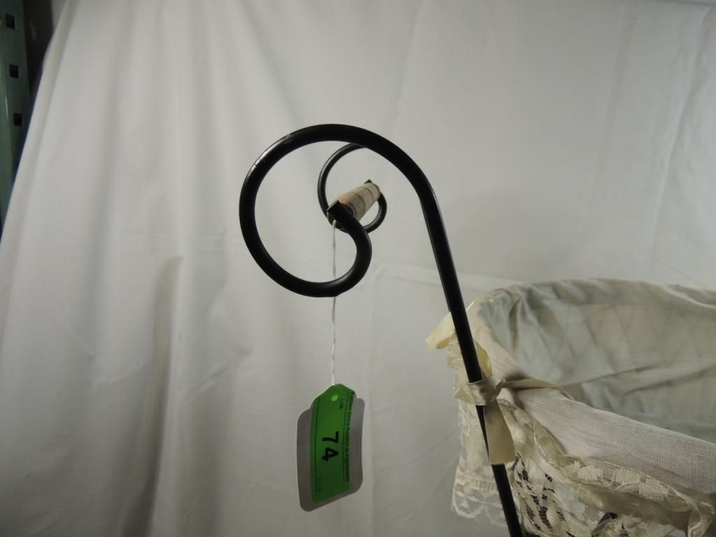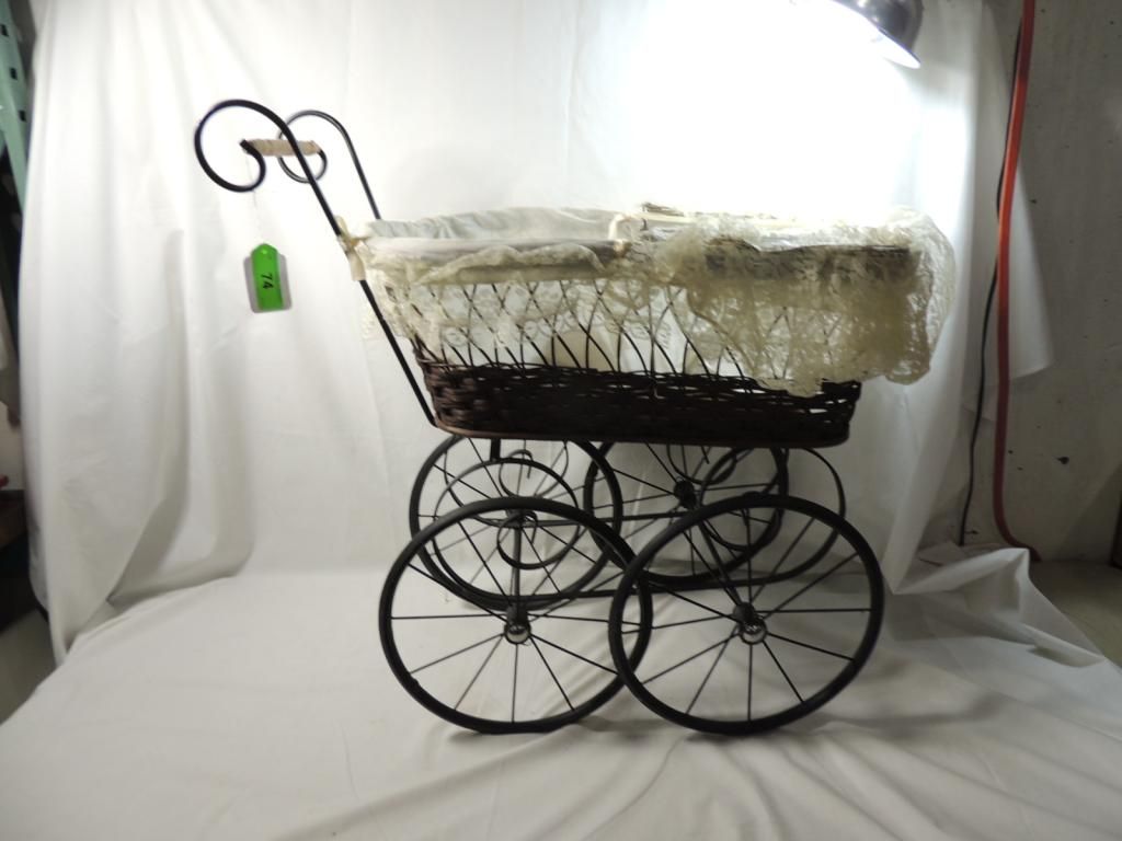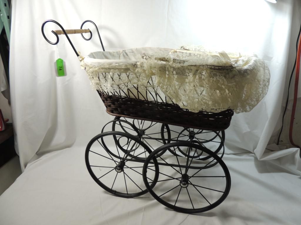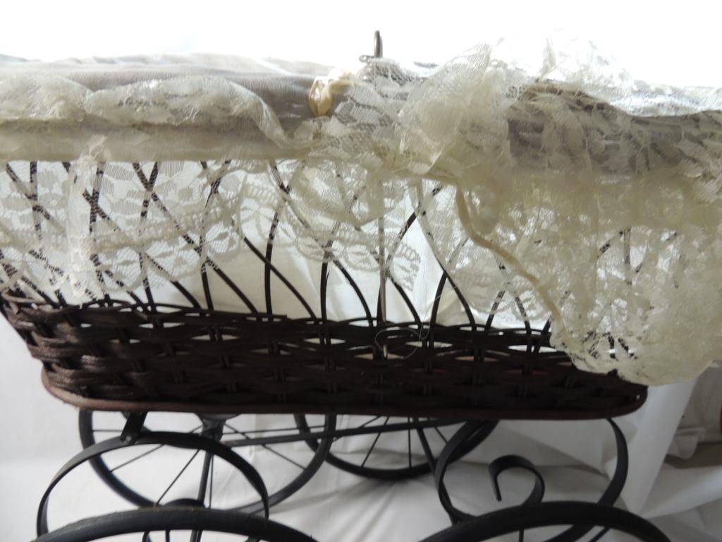 REPO VICTORIAN ANTIQUE STYLE BABY BUGGY CARRIAGE WOOD WICKER CANVAS METAL LACE. 22" TALL 23" LENGTH. AS SHOWN SEE PHOTO FOR MORE DETAILS.