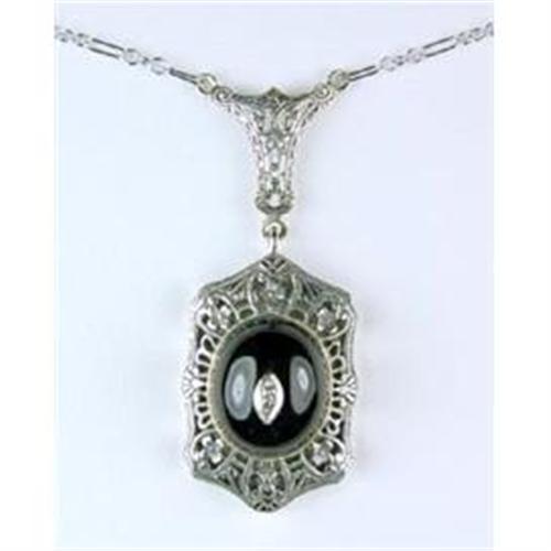 This Antique Style necklace is an Authentic & Accurate copy of one from the 1930s and THIS one is in MINT condition! It is a SOLID STERLING Silver necklace featuring a large domed BLACK ONYX with a center Diamond. The Black Onyx is surrounded by exquisite FILIGREE work, and it is suspended from a Sterling Silver chain. The Black Onyx pendant with the filigree work around it measures 1 1/4" x 3/4". The filigree chain is 18" in length, and including the pendant the necklace is 21" long. It IS an exquisite piece of jewelry.
