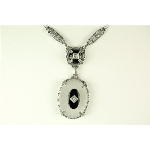 This ANTIQUE Style Necklace is an Accurate and Authentic copy of a Necklace from the 1930s but THIS one is in MINT condition! It is STERLING SILVER and it features a beautiful Oval CRYSTAL with a center BLACK ONYX set with a DIAMOND. There is another Black Onyx with Diamond abovd. This Antique Style Necklace is 18 inches in length and it also features very lovely filigree work.