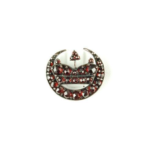 This Antique Style pin is an Authentic and Accurate copy of a PIN from the 1900's but this one is in MINT condition! It is VERMEIL (GOLD on Sterling) and it features 28 magnificent BOHEMIAN GARNETS in a half moon design. This PIN measures 1 1/8" x 1".