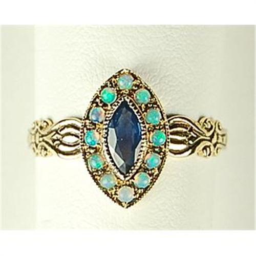This beautiful Antique Victorian Style ring is an Authentic and Accurate copy of a ring from the 1900's but THIS one is in MINT condition. It is 9K Gold and it features a Marquise Cut AMETHYST that is surrounded by OPALS. The ring is a Size 8 and it can be resized.