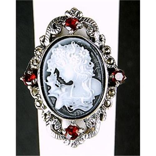 This STERLING SILVER ring is an Authentic and Accurate copy of a ring from the 1930's but THIS one is in MINT condition. It features a beautiful Oval CAMEO of a young woman looking to her right. The Cameio is surrounded by GARNETS with Marcasites as accent. This ring is a Size 7 1/4 and it can be resized.