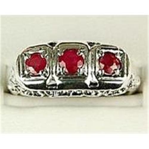 This ANTIQUE Style ring is an AUTHENTIC and ACCURATE copy of a ring from 1925 but THIS one is in MINT condition! It is STERLING SILVER and it features THREE beautiful Genuine Rubies = .70 CARATS total weight! The Rubies are surrounded by very beautiful filigree work that was typical of the 1920's. It is a Size 8 and it can be resized either larger or smaller.