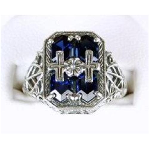 This Antique Style ring is an Accurate and Authentic copy of a ring from the 1930s' but THIS one is in MINT condition. It is Sterling Silver and it features SAPPHIRES surrounded by filigree work. This lovely ring is currently a size 6 and can be resized.