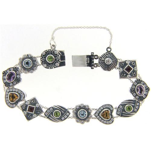 This Antique style SLIDE BRACELET is an Authentic & Accurate copy of a Slide Bracelet from the 1920's and THIS one is in MINT condition! It features 12 different Slides, each one set with a GENUINE GEMSTONE. This beautiful Slide Bracelet is all STERLING SILVER and it is 8" in length. The 12 Sterling Slides are set with many different Genuine Gemstones, including - Garnet, Amethyst, Peridot, Citrine and Blue Topaz. The bracelet is in Mint condition.