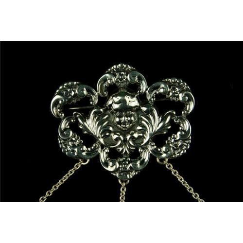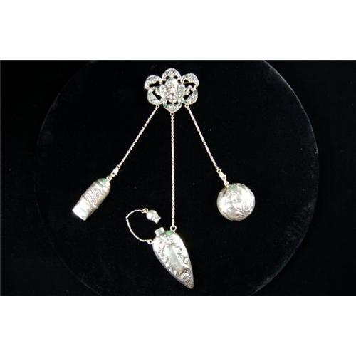 THIS CHATELAINE WAS EXQUISITELY MADE IN THE 'ART NOUVEAU' STYLE. It is a STERLING SILVER Art Nouveau Chatelaine Pin with three beautiful items hanging from it.