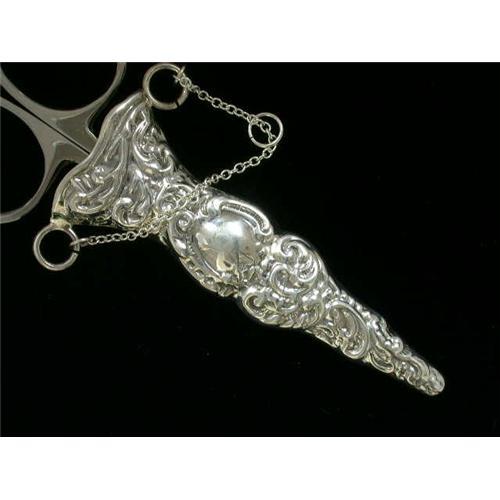 THIS ART NOUVEAU STYLE SCISSOR HOLDER AUTHENTICALLY AND ACCURATELY REPRODUCES ONE CIRCA 1900. It is a Solid STERLING Silver Art Nouveau holder for a pair of sewing scissors. It measures 3" in length, and it is in pristine condition (I am including a sewing scissor, but it is not Sterling)