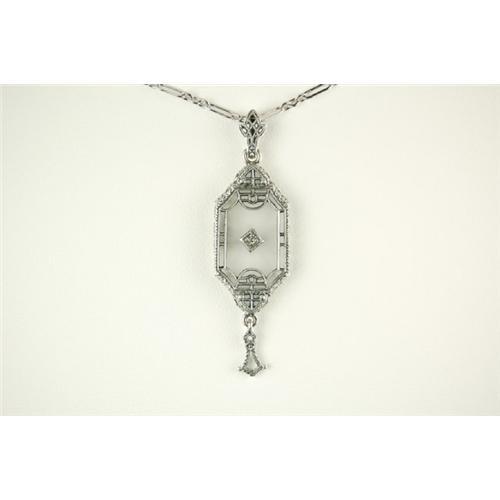 This ANTIQUE Style NECKLACE is an AUTHENTIC and ACCURATE copy of a Necklace from the 1930's and THIS one is in MINT condition! It is STERLING SILVER and it features a SUNRAY CRYSTAL PENDANT surrounded by very beautiful FILIGREE work with a DIAMOND in the center. This Pendant is suspended from a STERLING SILVER chain that is 18 inches in length.