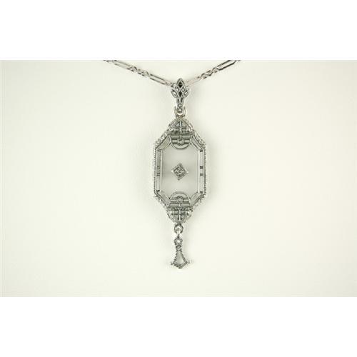 This ANTIQUE Style NECKLACE is an AUTHENTIC and ACCURATE copy of a Necklace from the 1930's and THIS one is in MINT condition! It is STERLING SILVER and it features a SUNRAY CRYSTAL PENDANT surrounded by very beautiful FILIGREE work with a DIAMOND in the center. This Pendant is suspended from a STERLING SILVER chain that is 18 inches in length.