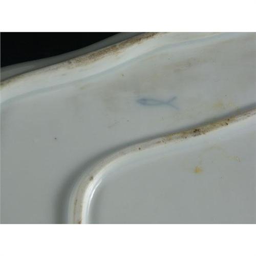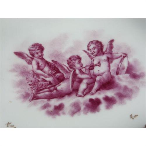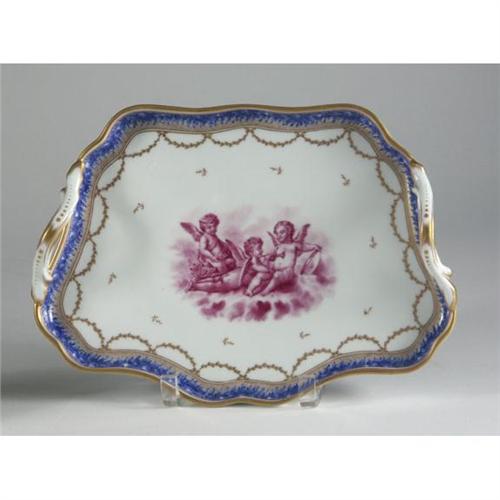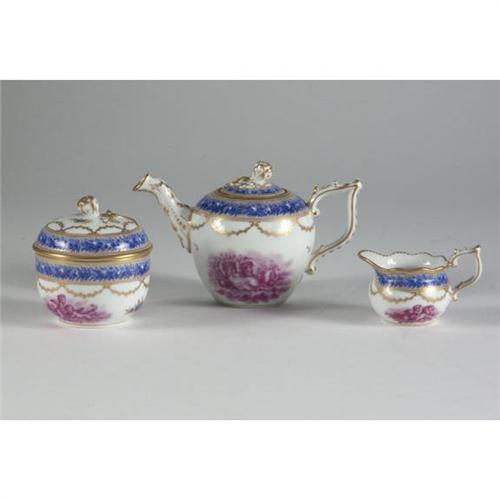 PORCELAIN: Exceptional Nyon (Switzerland, 1781-1813; underglaze blue fish-form cipher at underside ) porcelain teaset to include handled tray, teapot, cup and saucer, lidded sugar and cream pitcher, all with blue roses border and gilt highlights, putti scenes in puce camaieu; late 18th-early 19th c. Tray 12'' x 8.5''; teapot 3.5'' H; sugar and cup have approx. 3.5'' diameter. Some cellophane tape residue at side and underside of tray, vintage tag at saucer underside.