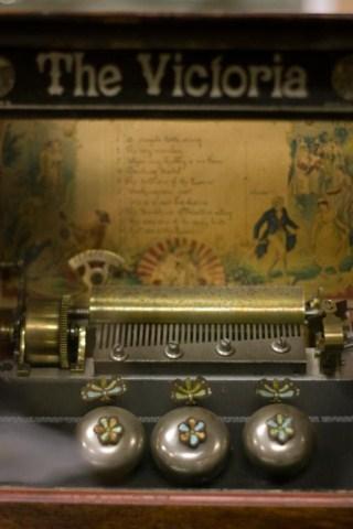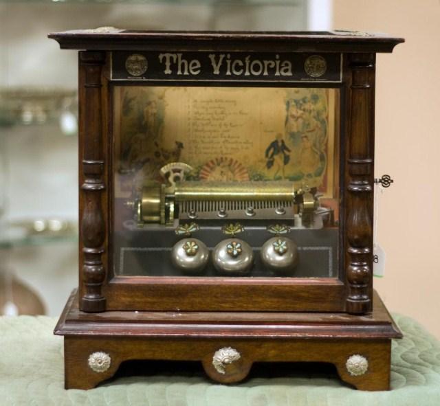 Antique Swiss table top music box made by B.H.A. in Ste. Croix, Switzerland. Called "The Victoria". Has ten songs written in English on a colorful song list depicting people and cherubs. Box has glass paneling on front and top. Has figural butterfly bell hammers. Case opens to front and has lock and key on the side. Winds up and plays. 17.5" height x 17" width x 11.5" depth.