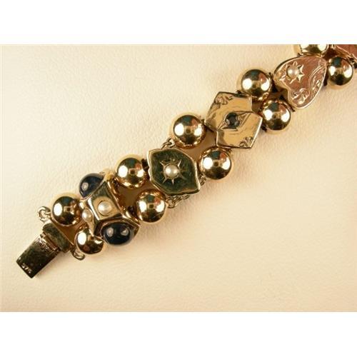 This ANTIQUE Style SLIDE BRACELET is an Authentic and Accurate copy of a SLIDE BRACELET Circa 1900 and it is in Superb condition! It is Solid 14k GOLD and it is set with Genuine EMERALD, SAPPHIRES, PEARLS, and RUBIES. This really beautiful GOLD SLIDE BRACELET is 7 1/2 inches so it will fit an average wrist as well as a slightly larger than average wrist.
