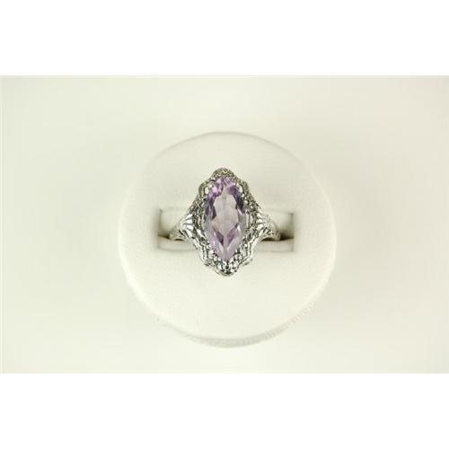 This ANTIQUE Style ring is an AUTHENTIC and ACCURATE copy of a ring from 1925 but THIS one is in MINT condition! It is STERLING SILVER and it features a beautiful Genuine Oval AMETHYST = 4 CARATS! The AMETHYST is surrounded by very beautiful filigree work that was typical of the 1920's. It is a Size 7 and it can be resized either larger or smaller.