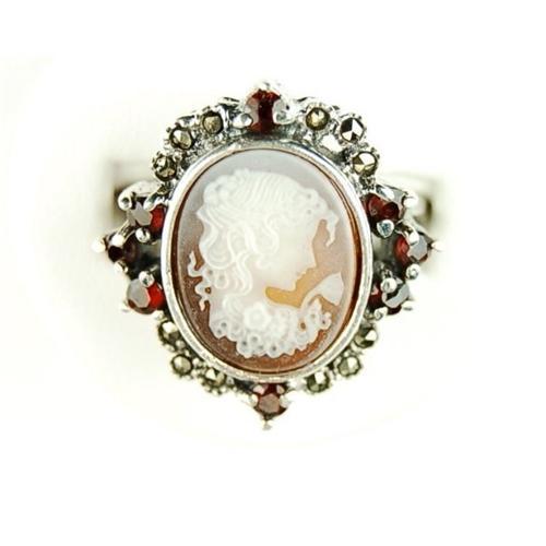 This ANTIQUE Style ring is an AUTHENTIC and ACCURATE copy of a ring from the ART NOUVEAU PERIOD Circa 1900 but THIS one is in MINT condition! It is STERLING SILVER and it features the CAMEO of a beautiful young woman in profile looking to her left. The CAMEO is surrounded by beautiful Sterling openwork set with GARNETS and MARCASITES . This ring is a size 7 and it can be resized. The top of the ring measures 1 inche x 1 inch.
