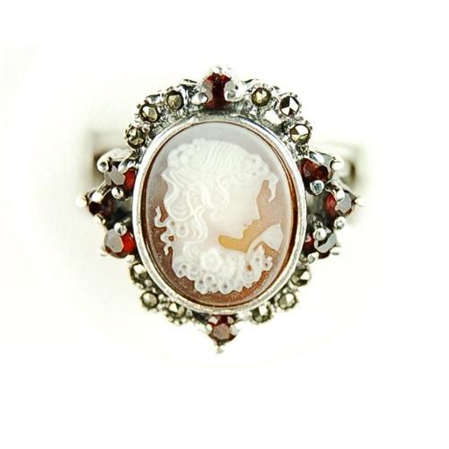 This ANTIQUE Style ring is an AUTHENTIC and ACCURATE copy of a ring from the ART NOUVEAU PERIOD Circa 1900 but THIS one is in MINT condition! It is STERLING SILVER and it features the CAMEO of a beautiful young woman in profile looking to her left. The CAMEO is surrounded by beautiful Sterling openwork set with GARNETS and MARCASITES . This ring is a size 7 and it can be resized. The top of the ring measures 1 inche x 1 inch.