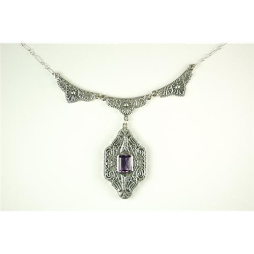 This Antique Style Pendant Necklace is an Authentic and Accurate copy of a Necklace from the 1930s and THIS one is in MINT condition! It is STERLING SILVER and it features an AMETHYST Pendant surrounded by Outstanding filigree work. The STERLING Necklace measures 22" in length including the AMETHYST Pendant.