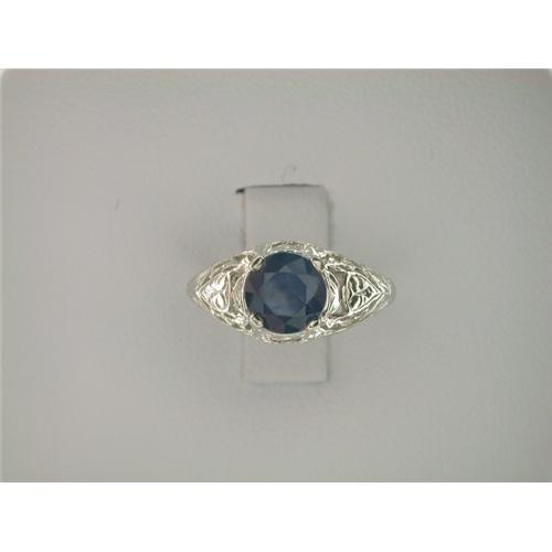 This Antique Style ring is an Authentic and Accurate copy of a ring CIRCA 1925 and THIS one is in MINT condition! It is a 14k White Gold FILIGREE Ring featuring a Round GENUINE SAPPHIRE = .90 Carats! The Sapphire is surrounded by exquisite Filigree work. This ring is a Size 5 1/2 and it can be resized either larger or smaller.