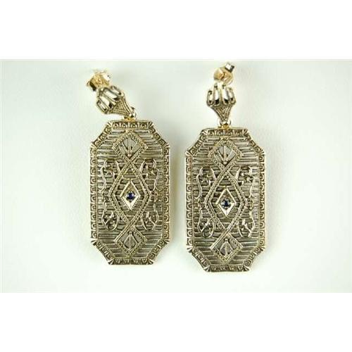 This pair of ANTIQUE Style Earrings are an AUTHENTIC & ACCURATE copy of a pair from the 1930's with FILIGREE work made popular during that era. They are 9K GOLD and each Earring features outstanding FILIGREE work with a center SAPPHIRE. The Earrings measure 2 inches in length inclusive of the post style tops.