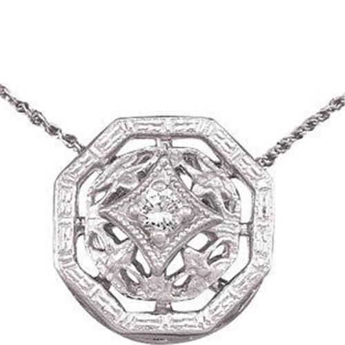 This Antique Style 14k White Gold SLIDE PENDANT features exquisite Filigree work surrounding a center DIAMOND. The Slide is Octagon shaped with etching on the 14k White Gold Frame. (The chain can be purchased separately)