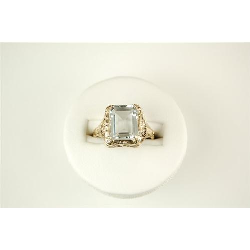This Antique Style ring is an Authentic and Accurate copy of a ring CIRCA 1925 and THIS one is in MINT condition! It is a 14k Yellow Gold FILIGREE Ring featuring a beautiful Rectangular GENUINE AQUAMARINE = THREE CARATS! The AQUAMARINE is surrounded by very Beautiful Filigree work. This ring is a Size 6 1/2 and it can be resized either larger or smaller.