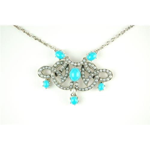 This Antique Victorian Style Necklace is an Authentic and Accurate copy of a Necklace from the 1900's and THIS one is in MINT condition! It is a STERLING Silver VICTORIAN Style Necklace featuring a Pendant set with TURQUOISES and PEARLS in a beautiful swirled design. Three of the Turquoises dangle from the bottom of the Pendant which is suspended from a Sterling Silver Neck Chain. The Necklace is 16 inches in length.
