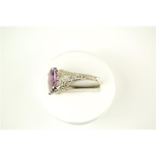 This ANTIQUE Style ring is an AUTHENTIC and ACCURATE copy of a ring from the 1930s but THIS one is in MINT condition! It is 14k WHITE Gold and it features a Genuine Cushion Cut AMETHYST = FOUR CARATS! The AMETHYST is surrounded by exquisite FILIGREE work, typical of the period. This ring is a Size 8 3/4 and it can be resized either larger or smaller.