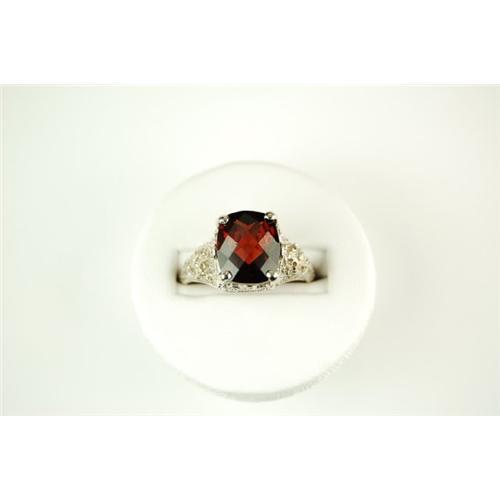 This ANTIQUE Style ring is an AUTHENTIC and ACCURATE copy of a ring from the 1930s but THIS one is in MINT condition! It is 14k WHITE Gold and it features a Genuine Cushion Cut GARNET = FIVE CARATS! The GARNET is surrounded by Outstanding FILIGREE work, typical of that period. This ring is a Size 8 3/4 and it can be resized either larger or smaller.