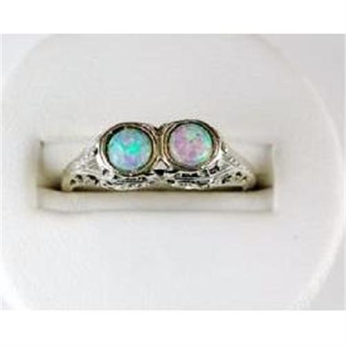 This ANTIQUE Style ring is an AUTHENTIC and ACCURATE copy of a ring from 1925 but THIS one is in MINT condition! It is STERLING SILVER and it features TWO beautiful Genuine OPALS = .84 CARATS! The OPALs are surrounded by very beautiful filigree work that was typical of the 1920's. It is a Size 8 and it can be resized either larger or smaller.