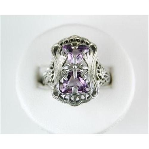 This ANTIQUE Style ring is an AUTHENTIC and ACCURATE copy of a ring from the 1930's but THIS ring is in MINT condition! It is STERLING SILVER and it features 2 beautiful AMETHYSTS. The AMETHYST Total Weight = 4 CARATS and they are surrounded by exquisite FILIGREE work. This ring is a Size 8 and it can be resized.