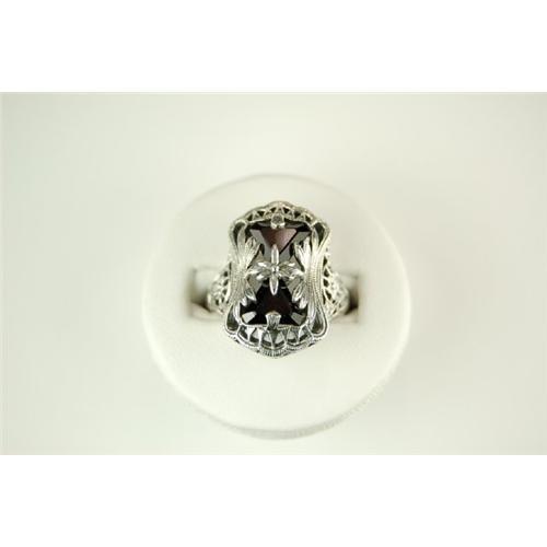 This ANTIQUE Style ring is an AUTHENTIC and ACCURATE copy of a ring from the 1930's but THIS ring is in MINT condition! It is STERLING SILVER and it features 2 beautiful GARNETS. The GARNET Total Weight = 4 CARATS and they are surrounded by exquisite FILIGREE work. This ring is a Size 6 1/4.