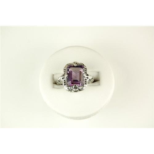 This ANTIQUE Style ring is an AUTHENTIC and ACCURATE copy of a ring from 1925 but THIS one is in MINT condition! It is STERLING SILVER and it features a beautiful Genuine AMETHYST = 3 CARATS! The AMETHYST is surrounded by very beautiful filigree work that was typical of the 1920's. It is a Size 5 and it can be resized either larger or smaller.