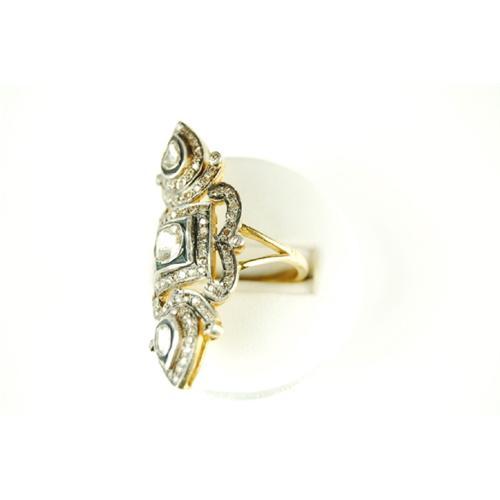 This ANTIQUE Style ring is an AUTHENTIC and ACCURATE copy of a VICTORIAN Ring from the 1890's but THIS one is in MINT condition! It is 14k Yellow Gold and it features 3 LARGE ROSE CUT DIAMONDS surrounded by smaller Diamonds. THE DIAMOND TOTAL WEIGHT = TWO CARATS! This ring measures 1 1/2 inches in length and it is a Size 8. It can be resized either larger or smaller.