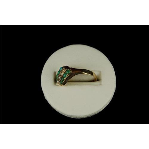 This Antique Victorian Ring is 9K Gold and it features TURQUOISES in combination with SEED PEARLS. The ring is a Size 7 1/4 and it can be resized.