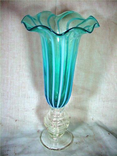ANTIQUE TALL ART GLASS VASE IN TRANSLUSCENT BLUE WITH WHITE VERTICAL CANDY STRIPES. 14"