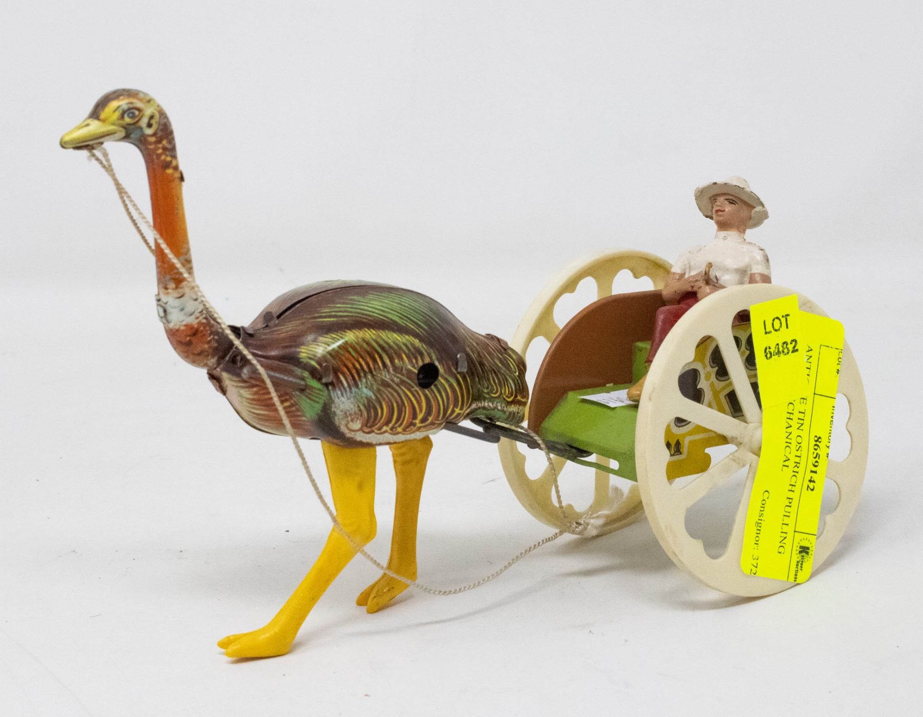 ANTIQUE TIN OSTRICH PULLING CART MECHANICAL