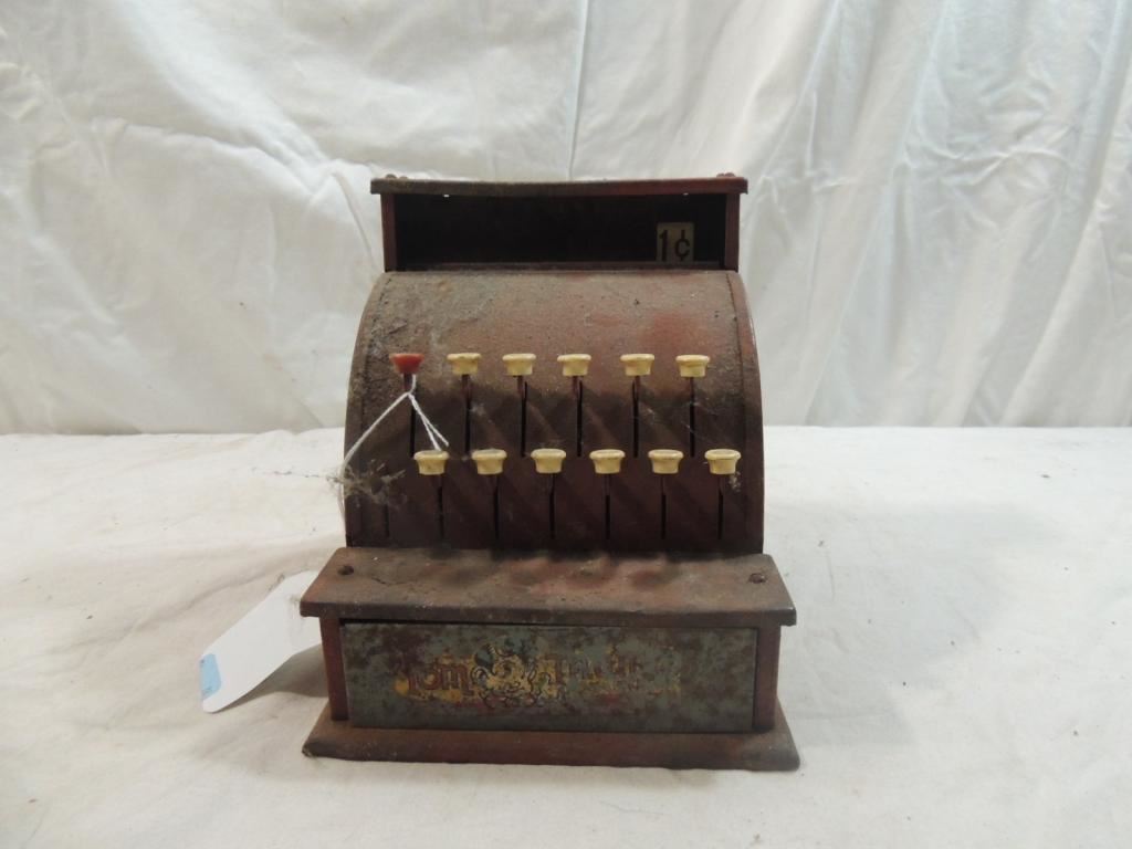 TOM THUMB MECHANICAL CASH REGISTER TOY, ANTIQUE REGISTER TOY, METAL TOY, AS SHOWN SEE PHOTO FOR MORE DETAILS.