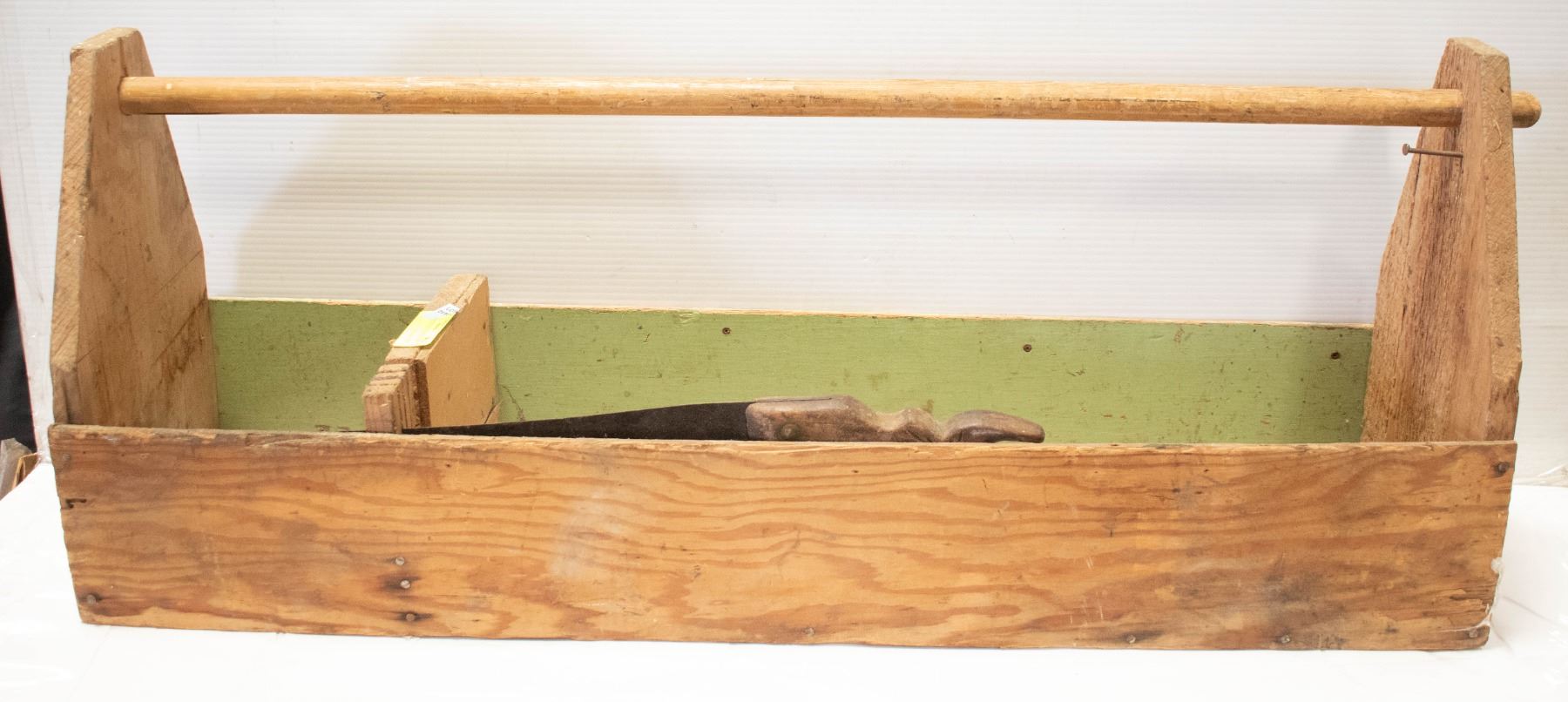 ANTIQUE TOOL BOX WITH WOOD SAW     **ALL ITEMS MUST BE REMOVED BY 5PM SATURDAY, JULY 1ST 2023. ALL REMAINING ITEMS WILL BE SUBJECT TO A $6.00 PER DAY STORAGE CHARGE. ANY ITEMS REMAINING AFTER MONDAY, JULY 17TH, 2023 WILL BE CONSIDERED FORFEITED. NO REFUNDS WILL BE ISSUED FOR FORFEITED ITEMS. TO SCHEDULE A PICK UP APPOINTMENT CLICK HERE