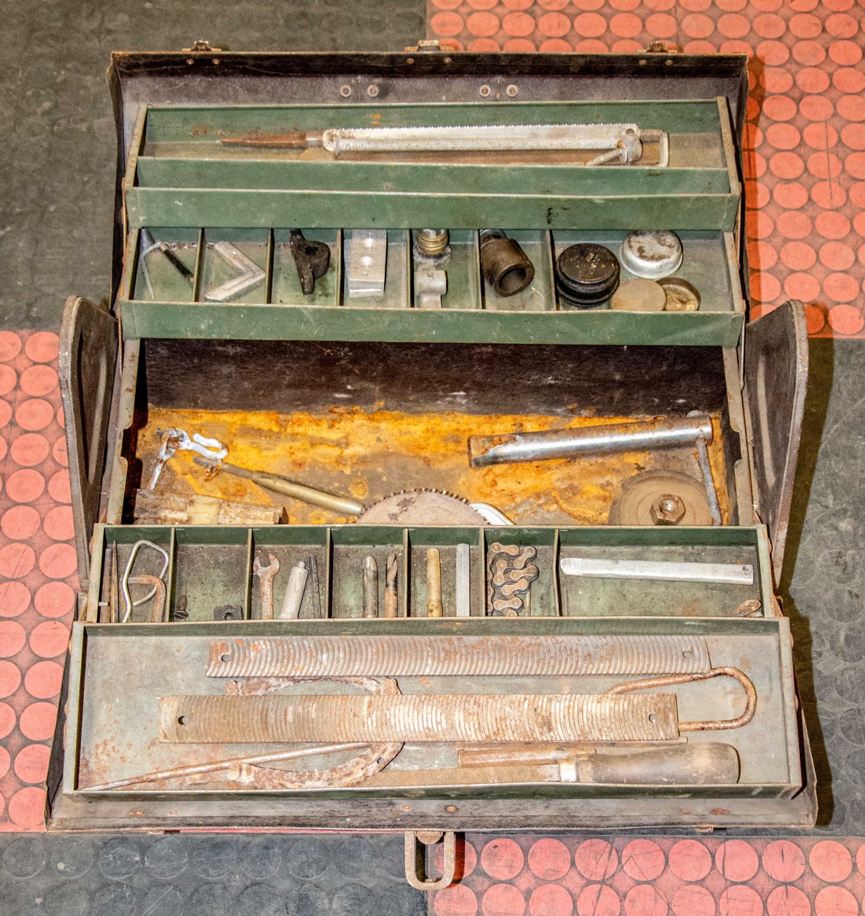 ANTIQUE TOOLBOX (HAS LEATHER HANDLE) W/ CONTENTS
