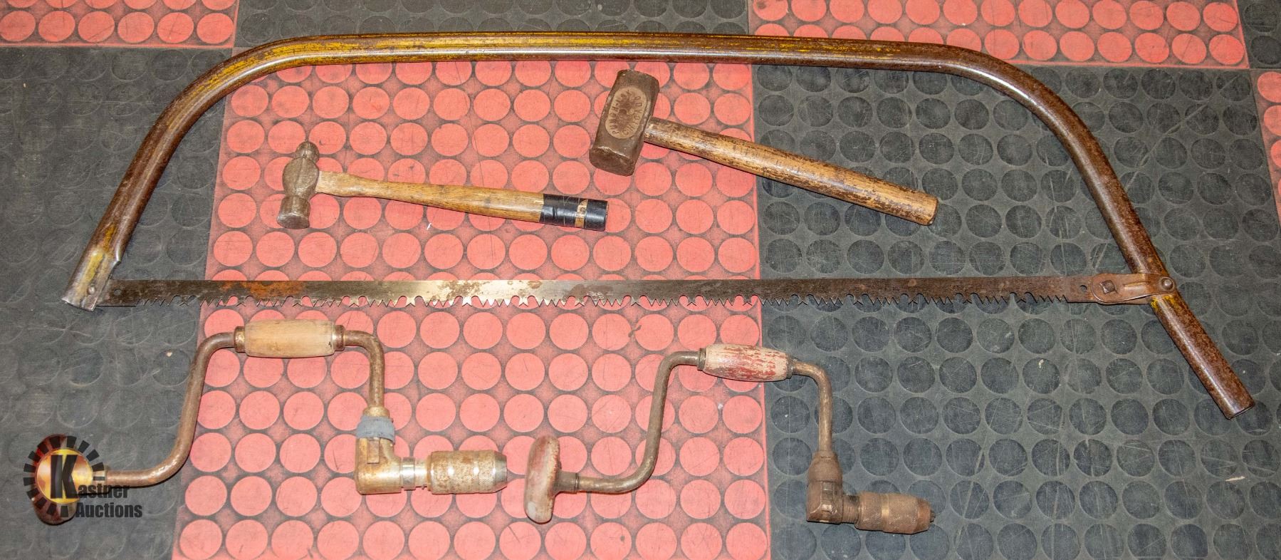ANTIQUE TOOLS LARGE SAW, HAND DRILLS