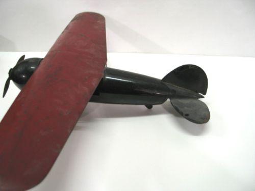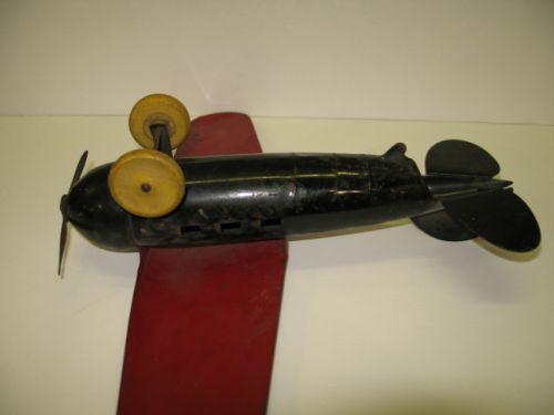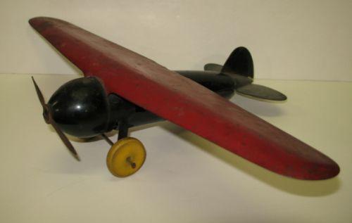 ANTIQUE TOY AIRPLANE. Rests on yellow painted wooden wheels. Has red painted wings and black painted body. Shows minor loss to paint at areas. 12” L