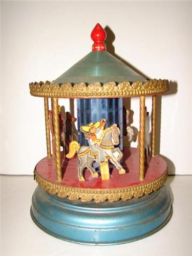ANTIQUE MUSICAL TOY CAROUSEL. Tin wind-up carousel features 5 cardboard children on horses with applied lithographs. Shows some signs of rusting. Two cardboard horses and children have become unattached. 13” H