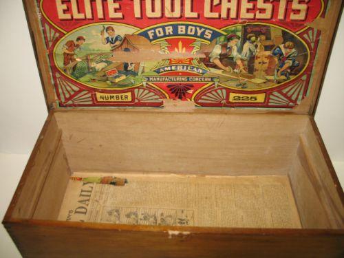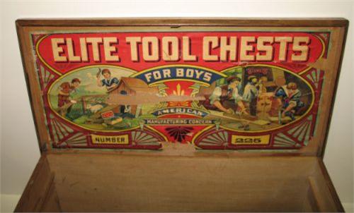 ANTIQUE SOFTWOOD TOY TOOL CHEST. Dovetailed casing. Metalware handles at both sides. Paper label on under side of lid reads “Elite Tool Chests-For Boys-American Manufacturing Concern-Number 225”. 6.75” H, 17.5” W, 9” D