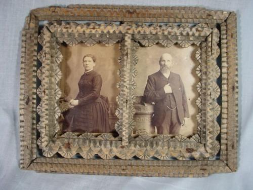 ANTIQUE TRAMP ART DOUBLE PICTURE FRAME WITH ANTIQUE PORTRAITS, MALE AND FEMALE. 12" 9".