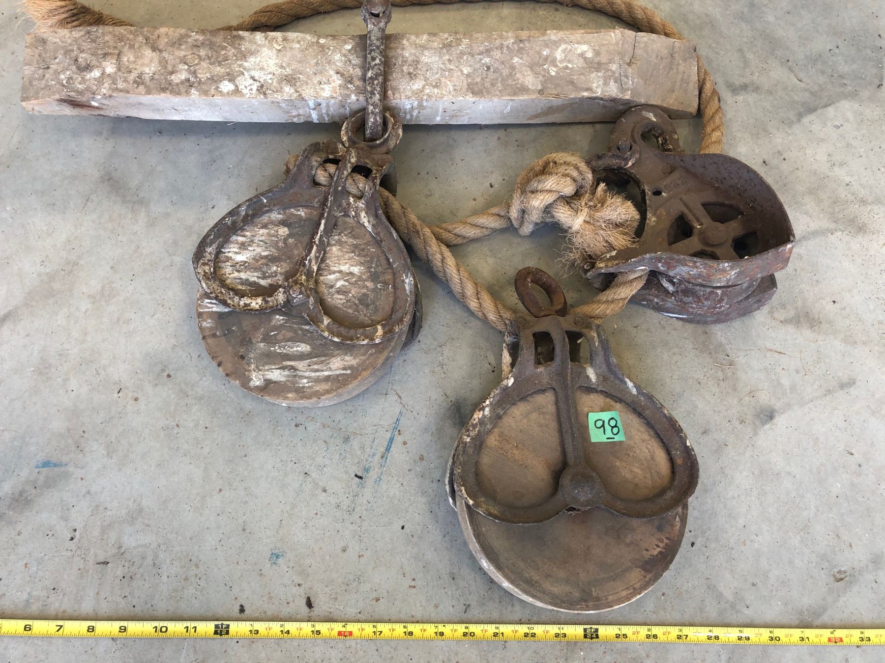 ANTIQUE TRIPLE PULLEY AND MOUNT RIG