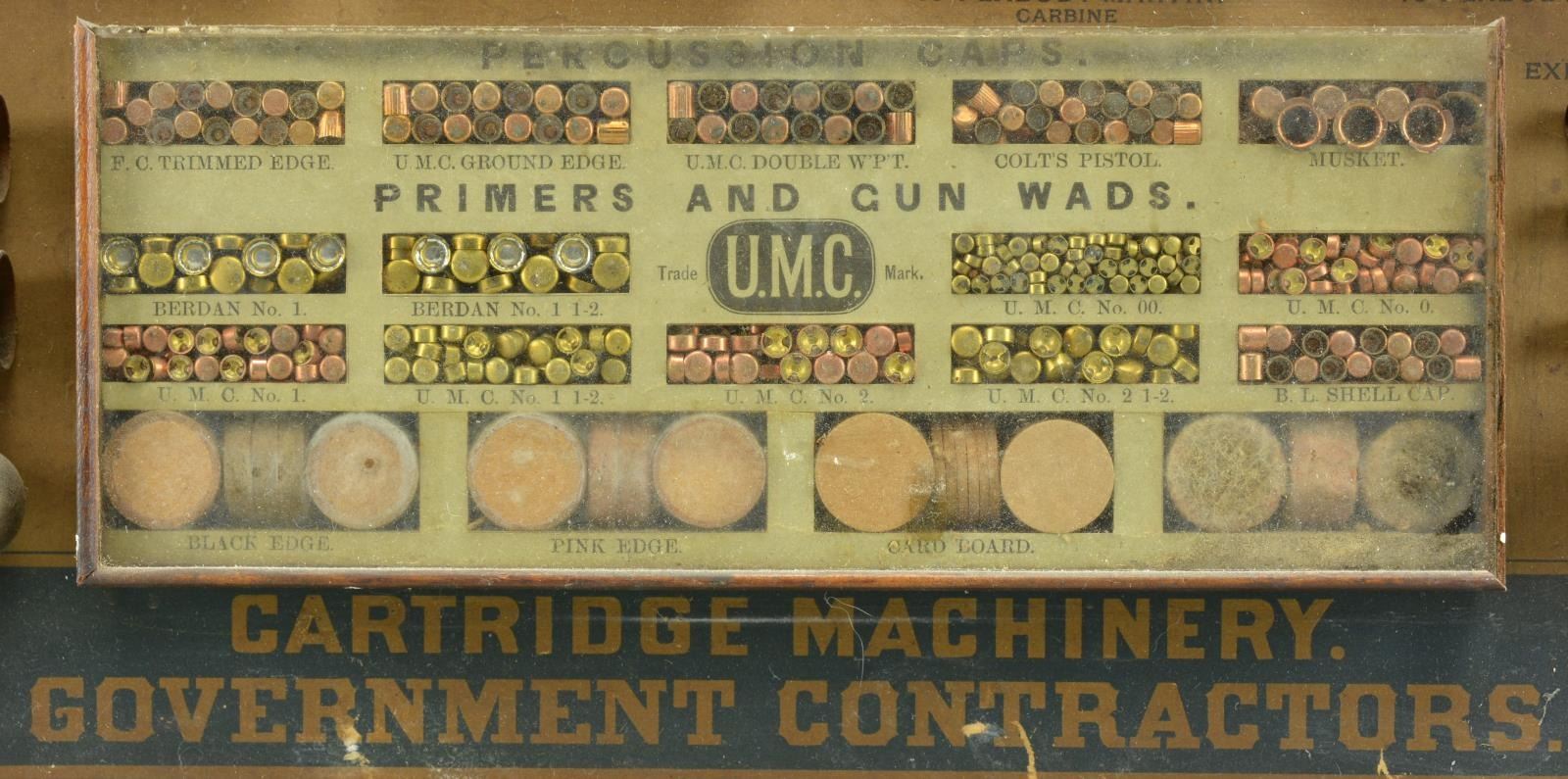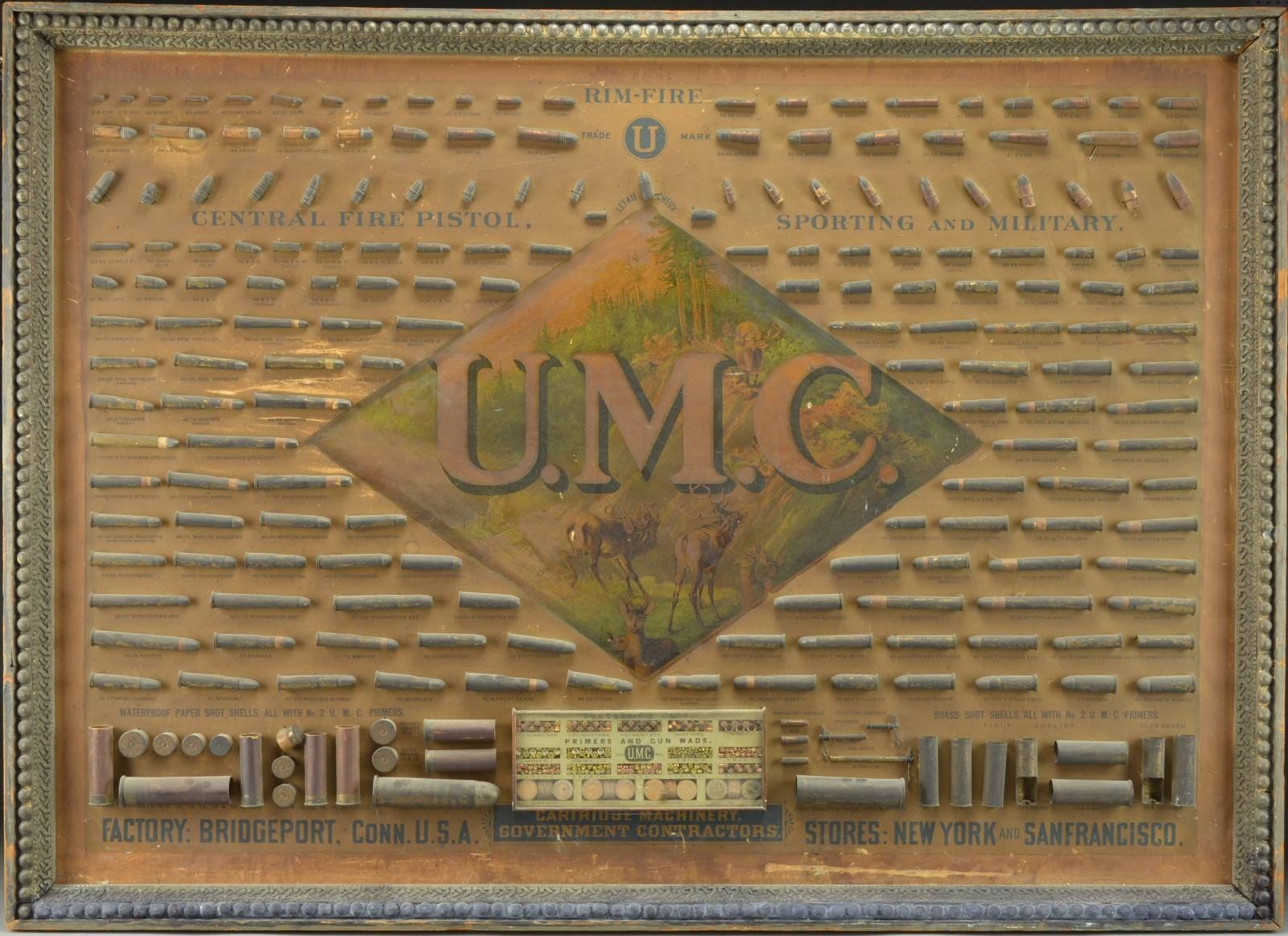 AND CARTRIDGE BOARD. Diamond shaped center panel depicts a mountain elk herd scene overlaid with UMC logo. Top 2 rows display 36 rimfire cartridges beginning with the diminutive BB cap on left, increasing to the .58 Springfield on the right. Below the rimfire cartridges are a display of 10 cast lead bullets on the left, 3 rounds of pinfire ammo in the center and 10 paper patched bullets on the right. Main portion exhibits 117 central fire cartridges ranging from the .22 Extra Long CF to the .58 Transf'd Musket. Lower portion shows paper shot shells and case heads on the left along with a 1" Gatling cartridge. Center of display has a 9 3/8" X 3 3/4" box displaying percussion caps, primers and gun wads. Left side shows exploder shells, friction cannon primers and brass shot shell cases. Upper headings on display board are "Rim-Fire" / circle "U" trademark / "Central Fire Pistol / Sporting and Military". Lower heading states "FACTORY: BRIDGEPORT. Conn. U.S.A." & "CARTRIDGE MACHINERY. / GOVERNMENT CONTRACTORS" followed by "STORES: NEW YORK and SAN FRANCISCO". Address around bottom of central scene is marked "MAJOR, KNAPP & CO. / 56 Park Place N.Y." Image size: 41 5/8" x 28 7/8". Frame size: 47 1/8" x 33 7/8". Ornate wood frame has painted outer perimeter with ornately carved inner moulding having button type frontal ornamentation. CONDITION: main display has an age darkened & lightly faded appearance. Many of the brass cartridges show an intermittent dark tarnish. Original glass front on primer display is replaced with plexiglass. Frame shows wear and age darkening. Outer perimeter has worn & chipped paint. (02-17798/DS). $4,000-8,000.